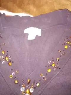 Es cafe, manga 3/4, cuello V, con piedritas enfrente, lisa viene amplia