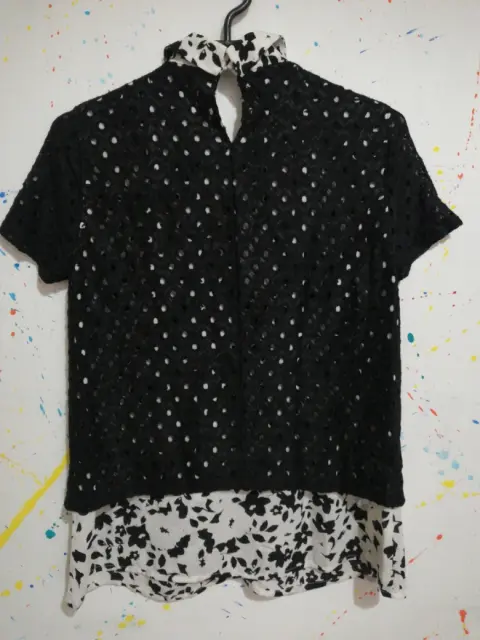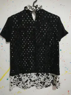 Blusa. Blusa blanco con negro.Tela poliester, nylon y spandexTalla xsDraquelado en negro y fondo blanco con flores negras. Manga corta y cuello