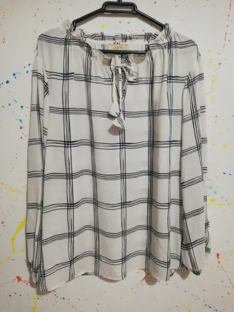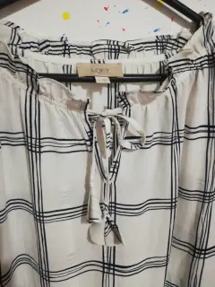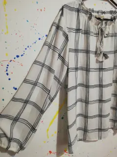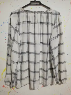 Blusa blanca de manga larga con lineas azules.Tela poliester. Talla medianaCuello con olan