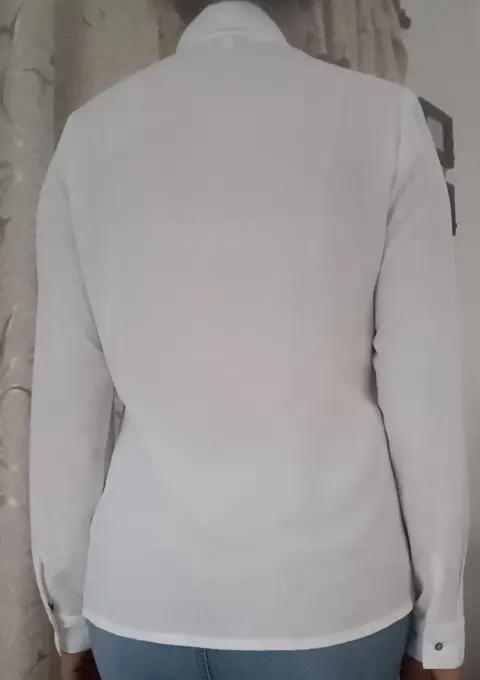 Blusa entre blanca y color crema con un lacito en el cuello lo pueden dejar suelto o en forma de moño muy elegante y bonita.