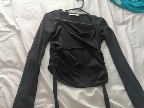 Blusa en color negro de manga larga, con tiras a los lados para hacerla corta. En talla S