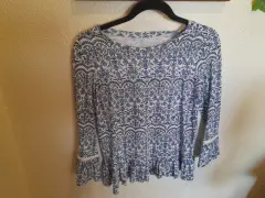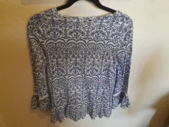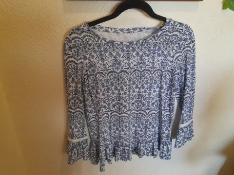 Blusa. Blusa floreada azul con blanco tipo encaje en los puños y en la parte de abajo