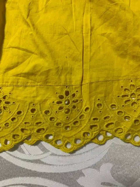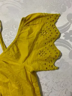 Blusa con tirantes, corte a los hombros, tela de algodón y detalles de aplicación en mangas y cintura. Color mostaza.Medidas/ hombros: 54 cm, busto: 50 cm, largo: 55 cm.