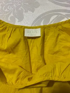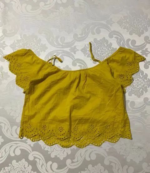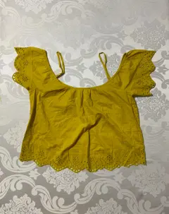 Blusa a los hombros. Blusa con tirantes, corte a los hombros, tela de algodón y detalles de aplicación en mangas y cintura. Color mostaza.Medidas/ hombros: 54 cm, busto: 50 cm, largo: 55 cm.