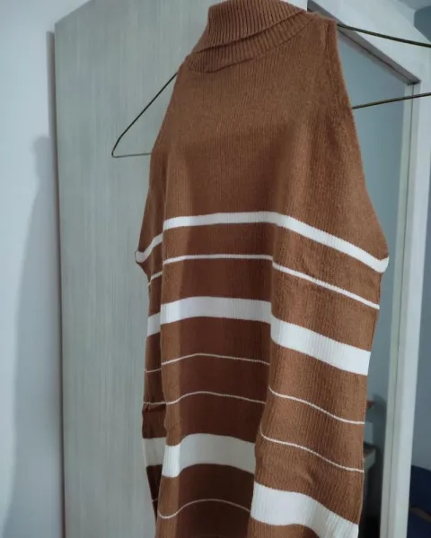 Blusa a rayas. Blusa café con líneas blancas de cuello de tortuga y sin mangas