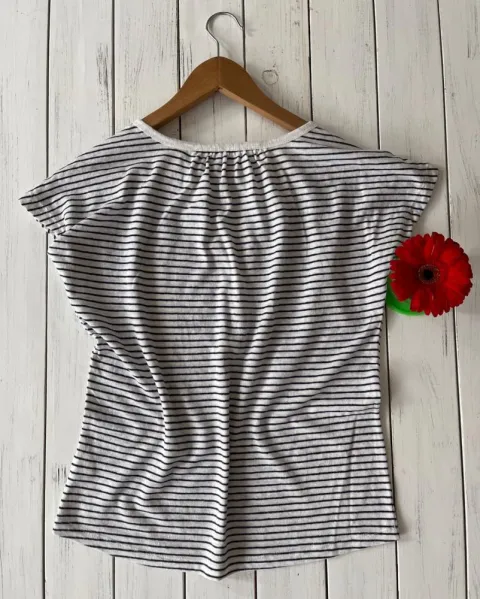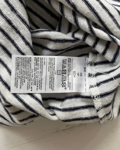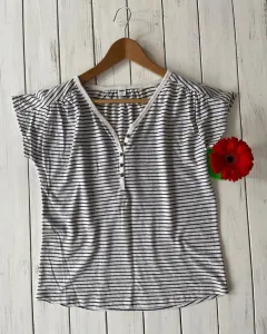 Talla: XS.Medidas: 51 cm de axila y 60 cm de largo.Botones al frente, manga corta, las rayas son negras. 52% lino y 48% poliéster.
