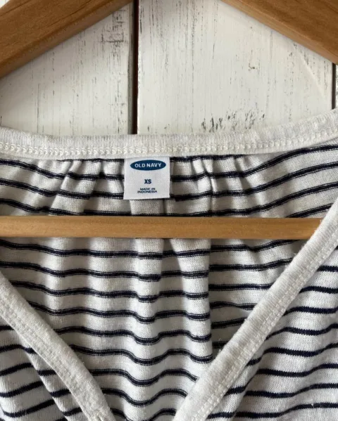 Blusa a rayas old navy. Talla: XS.Medidas: 51 cm de axila y 60 cm de largo.Botones al frente, manga corta, las rayas son negras. 52% lino y 48% poliéster.