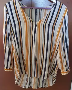 Blusa a rayas talla EG. Para un paseo fresco y cómodo por la ciudad 🏙 😉Blusa C&A de rayas en tonos azul, amarillo y blanco. De manga larga, con cintas para arremangarlas y botones. Talle alargado en la espalda.Talla EG, aunque también funciona bien como talla G👌🏼Lavada, planchada y sanitizada 🧼