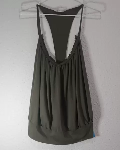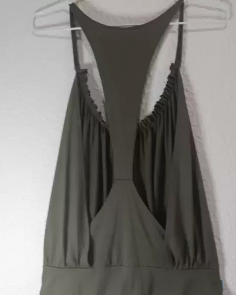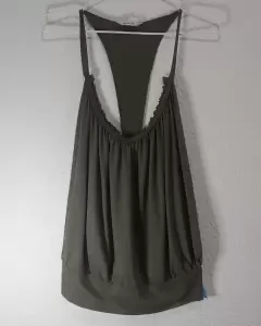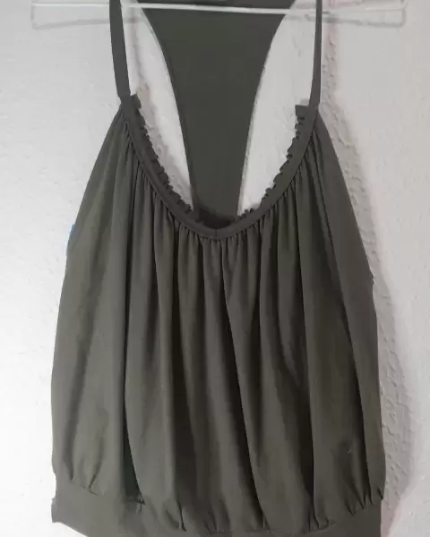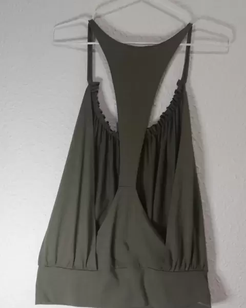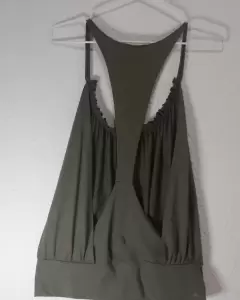 Playera abiertapor la espalda, con resorte en la parte baja y tirantes en la parte de arribaColor verde olivoIdeal para la playa o clima calidoSe puede usar con un top por debajo y es ideal para llevar con pantalones de mezclilla