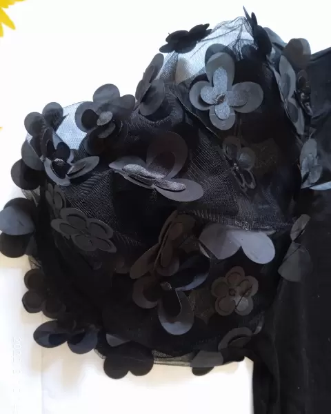 Es licra con algodón y las mangas son abullonadas floreada en 3D de manga corta, es talla Mediana que da de 30 a 32 ,color negro.