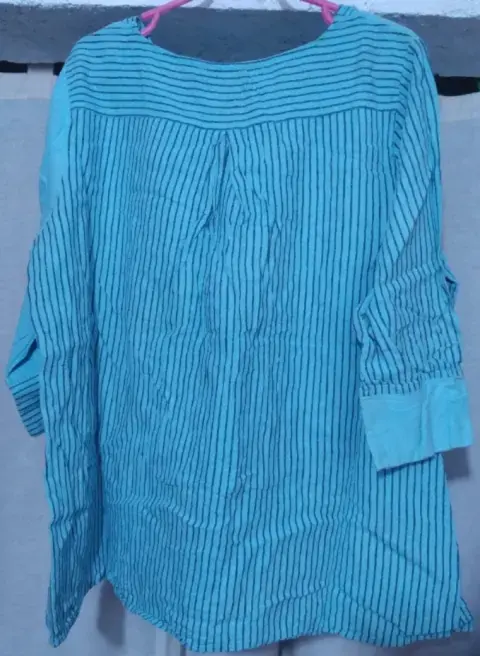 Blusa en color azul al frente y rayada en la parte de atrás, una manga es color azul lisa y la otra es rayada además trae una bolsita al frente talla L