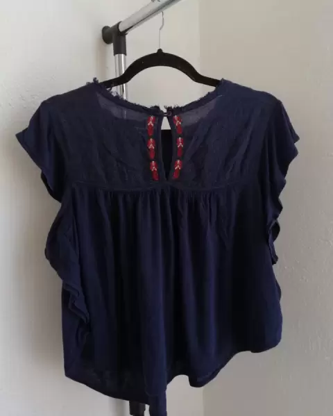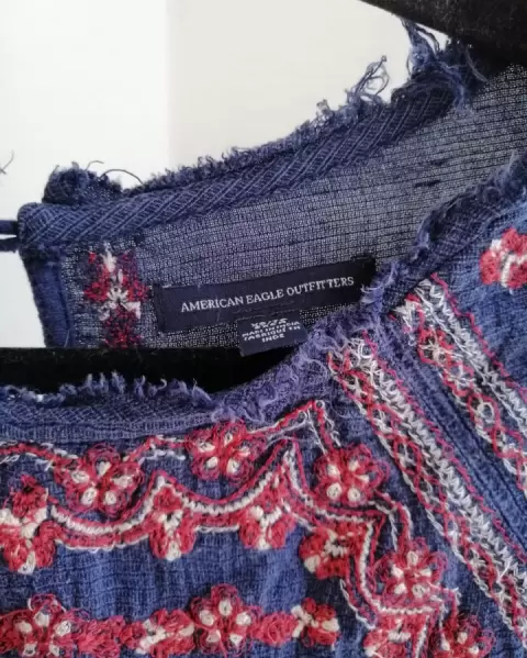 Blusa American eagle, súper fresca, la tela es algodon.Talla XS pero queda hasta S también De los lados caen olanes desde los hombros Pequeño detalle es hasta abajo de la blusa, es tamaño mini, se muestra en la ultima foto