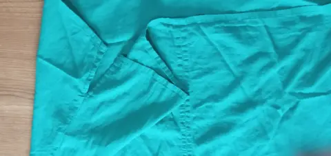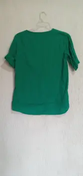 Blusa amplia. En color verde bandera, tela de lino, cuello en V con abertura, 61 cm de largo con abertura a los costados, manga con 1 botón y cinta con ojal para ajustar y modificar el diseño.
