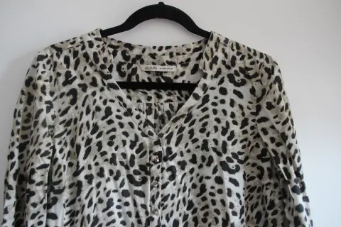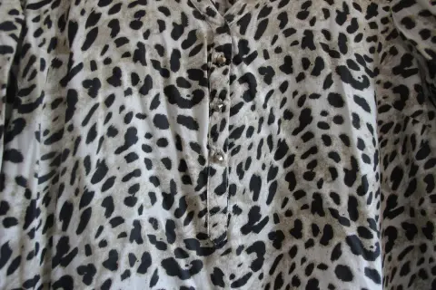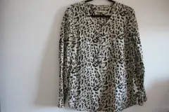 Blusa de manga larga con diseño animal print, los botones son redondos. No tiene detalles, no rota y no manchada. Marca Hollyland, talla G mide 72 cm de largo, 52 cm de axilas, hombro a hombro 40 cm (medidas aproximadas)