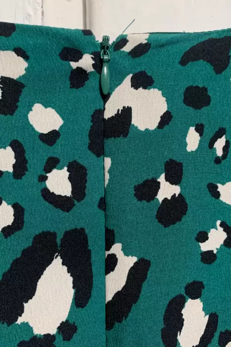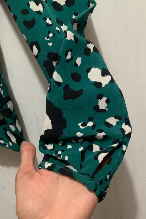 Blusa animal print manga larga dice talla S pero viene algo amplía, la manga es ligeramente abullonada trae un botoncito en cada puño y cierre oculto por atrás de axila a axila mide 47 y de largo 58
