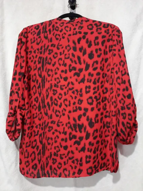 Blusa de poliéster en cuello v animal print roja, manga larga que se puede recoger con botón.