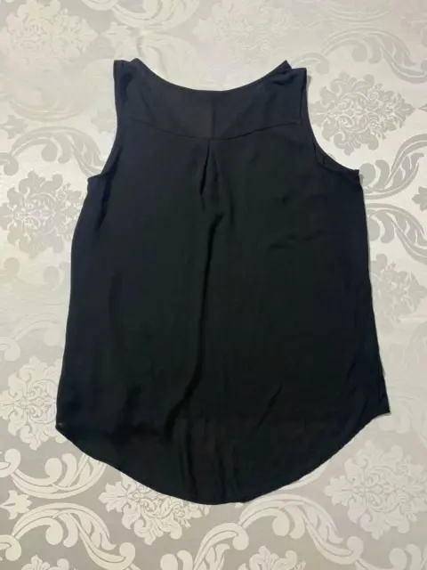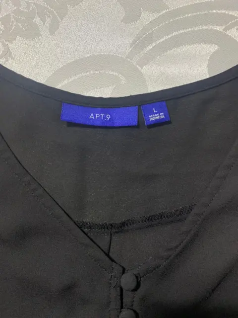 Blusa APT. 9. Blusa de tela ligera, transparente, sin mangas, cuello redondo con botones a medio pecho. Corte en A, largo frente más corto que el trasero.Medidas/ busto: 52 cm, cintura: 57 cm, largo frontal: 58 cm, largo trasero: 70 cm.