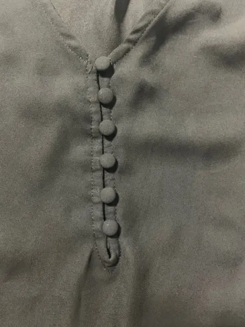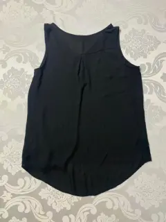 Blusa de tela ligera, transparente, sin mangas, cuello redondo con botones a medio pecho. Corte en A, largo frente más corto que el trasero.Medidas/ busto: 52 cm, cintura: 57 cm, largo frontal: 58 cm, largo trasero: 70 cm.
