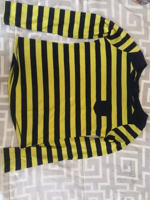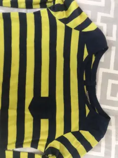Hermosa blusa de algodon a rayas azul con verde florecente manga larga con pequeña bolsita y botones atrás , talla chica MARCA ARIZONA