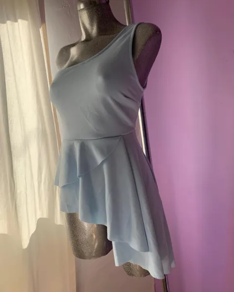 Hermosa blusa asimétrica color azul cielo, talla M. Le va bien a una chica también. Sus medidas son: 43cm de largo, 72cm de cintura, 40cm de axila a axila y 60cm de largo en el lado largo.