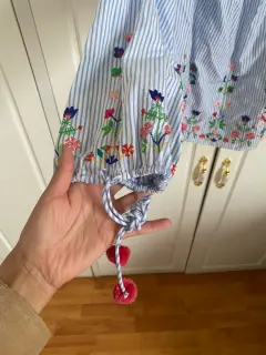 La blusa es color azul cielo, tiene varios detalles bordados y pompones en las mangas que se pueden ajustar