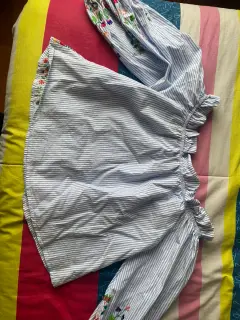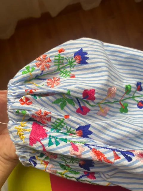 Blusa azul bordada. La blusa es color azul cielo, tiene varios detalles bordados y pompones en las mangas que se pueden ajustar