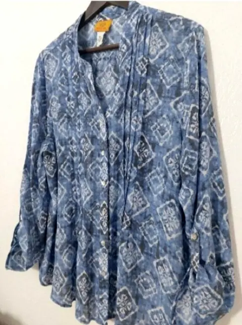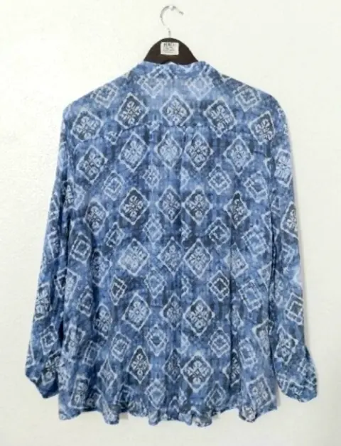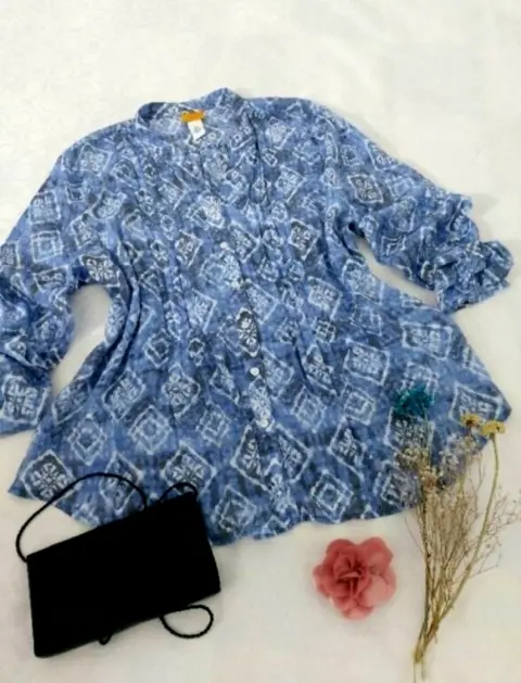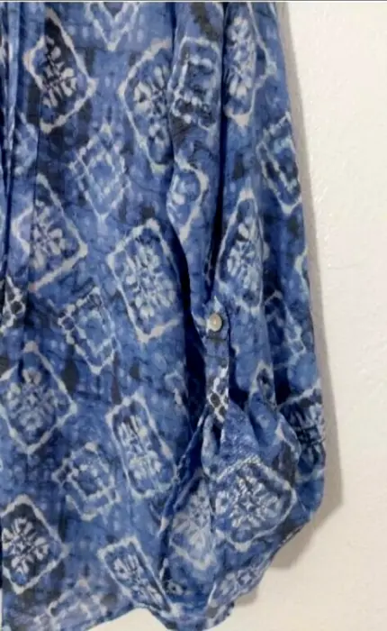 Blusa azul casual con estampado. Bella blusa de tela 65% rayón y 35% poliéster, casual, luce linda, la manga queda a 3/4.Talla XL.De axila a axila: 62 cmHombros: 47 cmLargo blusa: 70 cmLargo manga: 60 cm ( pero se puede doblar por que trae un boton a mitad de manga.
