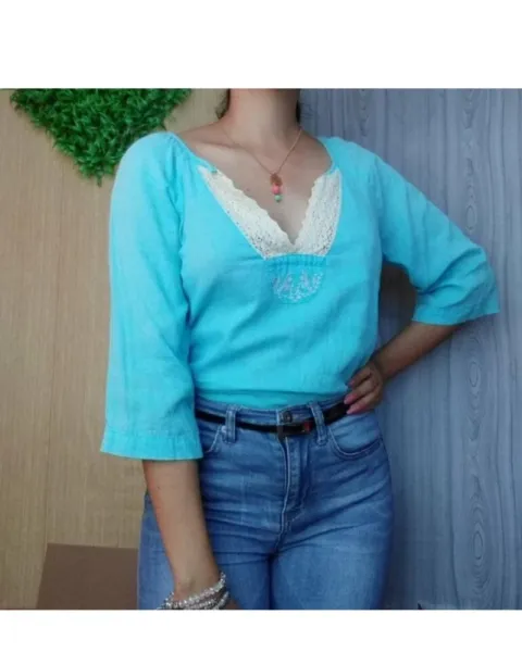 Blusa Azul cielo. Preciosa blusa manga 3/4, muy fresca y cómoda, tiene encaje en el escote v Muy Hermoso, queda a talla Chica muy bien , ideal para irse a la playa.