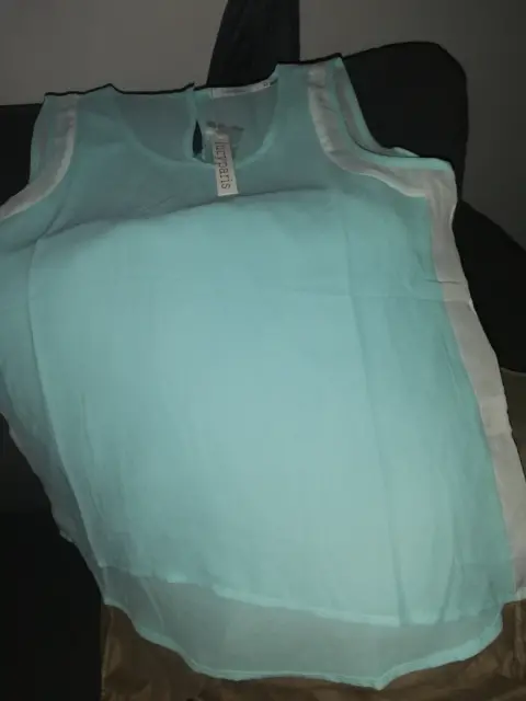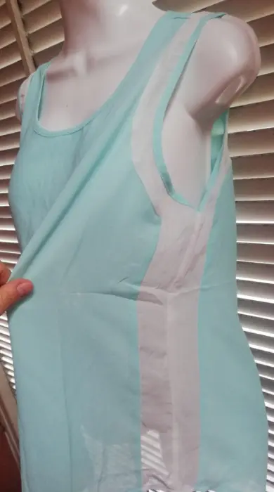 Bonita blusa sin mangas color azul con blanco en los costados es un poco holgada tela un poco delgada llega a transparentar un poco y esta más corta en la parte de adelante llega a la cintura talla M y es nueva con etiqueta marca Lucy París.