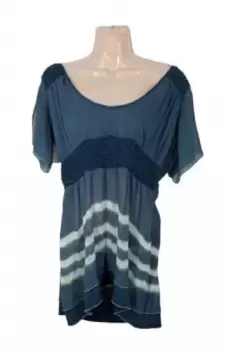 Blusa azul con blanco manga corta volada de tela súper delgadita y Fresca y semi transparente con escote redondo bajo, con plisado elástico al frente y en los hombroselástico