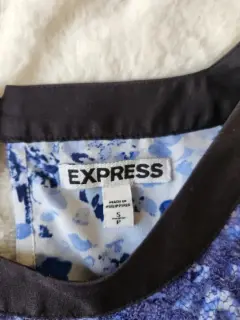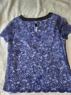 Blusa azul, marca Express.Talla S (45 cms de axila a axila)Tiene manga cortaLa blusa se conforma por un fondo de flores azules con blanco y una tela de encaje azul encima.Tiene un botón en la parte de atrás.