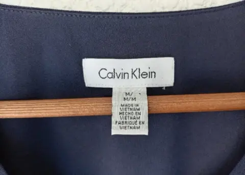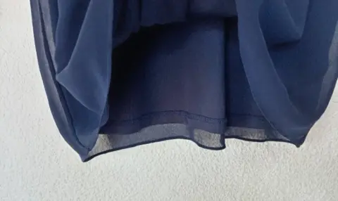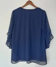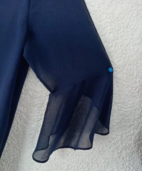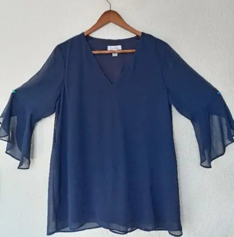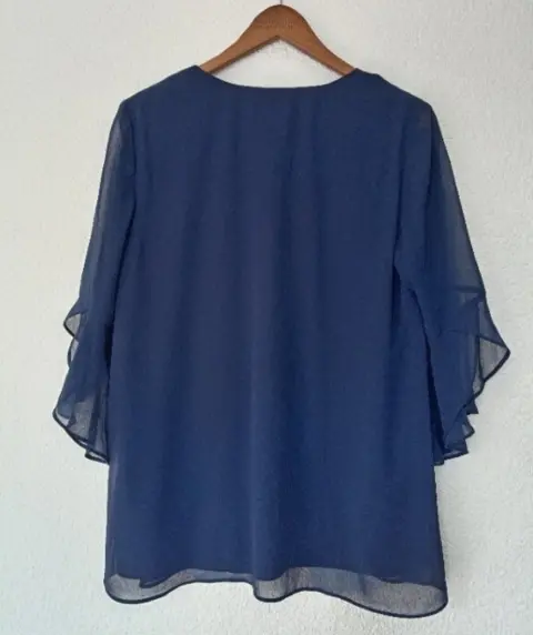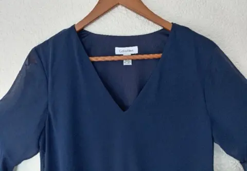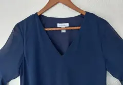Blusa azul marino, Calvin Klein, con superposición transparente y mangas 3/4. En excelente estado
