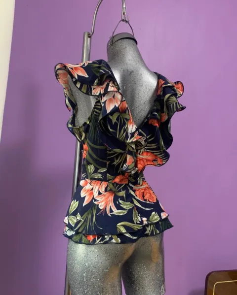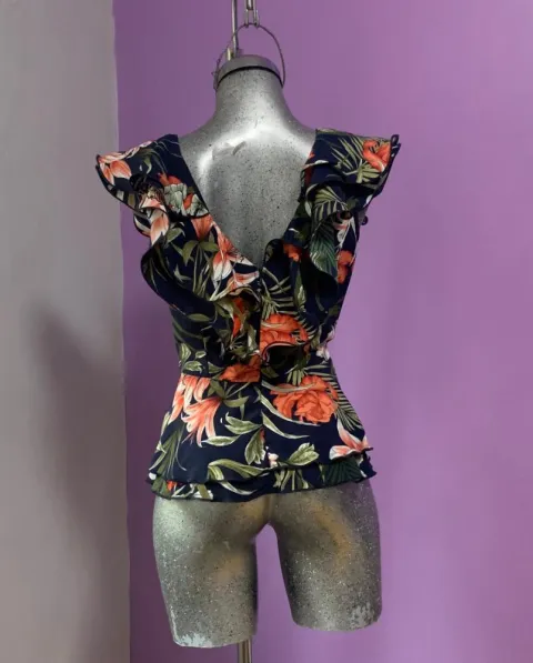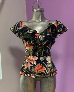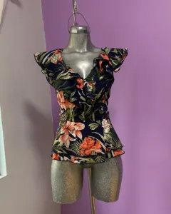 Preciosa blusita azul marino con flores, escote en V y tipo peplum. Es talla chica, no da a mediana porque la tela no estira.Sus medidas son: 60cm de largo, 70cm de cintura, 45cm de axila a axila