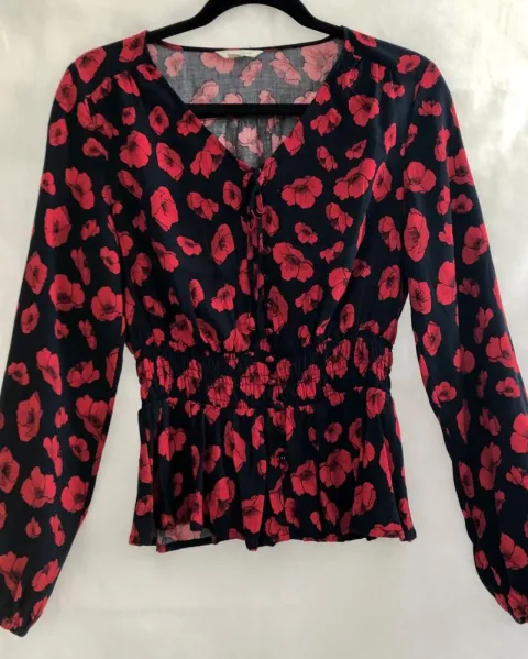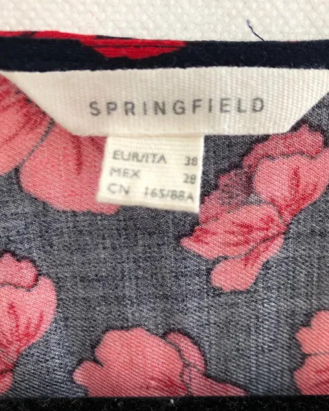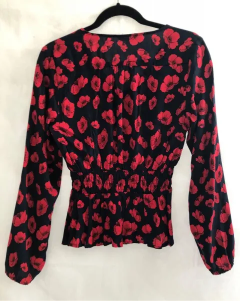 Blusa azul marino Springfield. Blusa azul marino con flores rojas ,botones al frente.Manga larga con resorte al final.