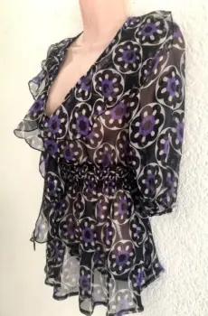 Blusa azul marino con morado queda a talla S-XS (8), proporcionó medidas, es de tela transparente, súper fresca para la temporada cuello en v con olanes súper sexy manga corta.