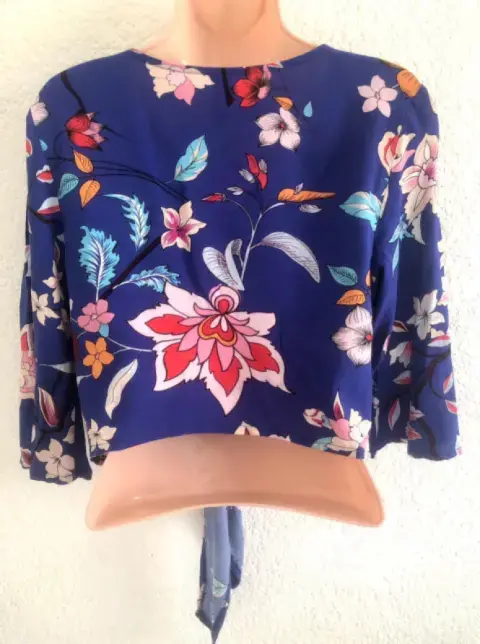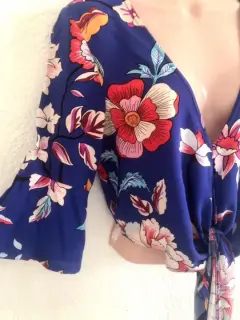 Blusa azul morado con flores en rojo, rosa etc, con cuello v, con tira al frente para nudo, es crop top super Linda y Fresca, manga 3/4 súper Fresca e ideal para para la temporada, es talla S