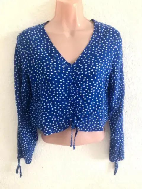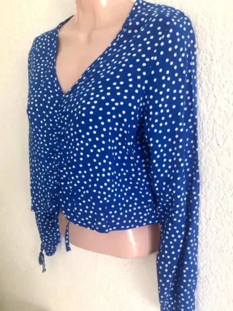 Blusa azul con puntos blancos, con fruncido al frente, cuello v, manga larga es talla L, puedo mandar medidas, es top crop, súper fresca ideal para la temporada.
