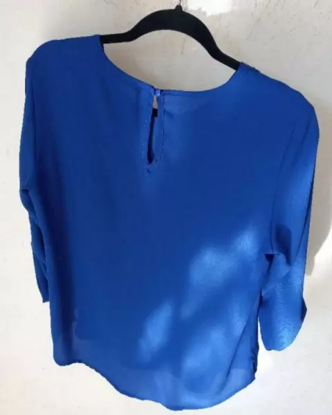 Blusa azul rey. Blusa azul rey es más larga de atrás un poco, cuenta con abertur en la espalda alta zona abajo de cuello y un boton. En la mangas cuenta con botones simulando recogido en las mismas son adorno. Talla 38. Si te interesa algo más te mejoro precio.