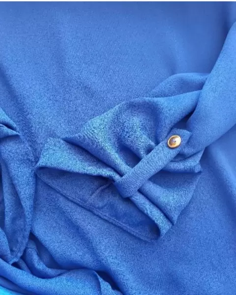 Blusa azul rey es más larga de atrás un poco, cuenta con abertur en la espalda alta zona abajo de cuello y un boton. En la mangas cuenta con botones simulando recogido en las mismas son adorno. Talla 38. Si te interesa algo más te mejoro precio.