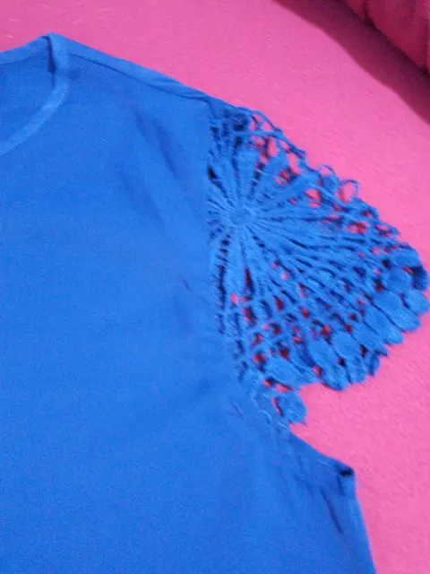 Blusa de tela delgada y suave, no transparenta, color azul vivo, ligeramente suelta.