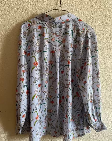 Blusa de manga larga , la tela es poliéster , el fondo es azul con flores. Esta súper bonita