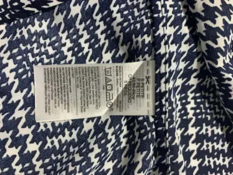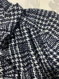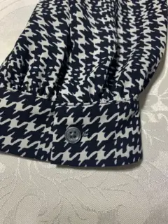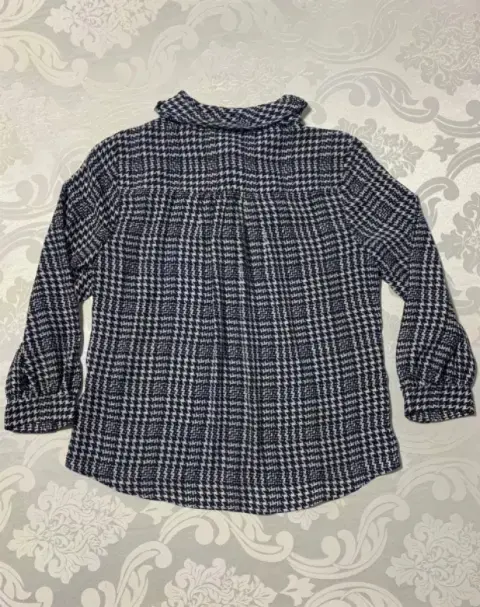 Blusa manga larga, cuello alto con extensión a pañuelo, tela ligera con estampado de pata de gallo. Queda a una talla S/M, no estira.Medidas/ busto: 53 cm, cintura: 51 cm, largo: 57 cm.
