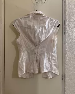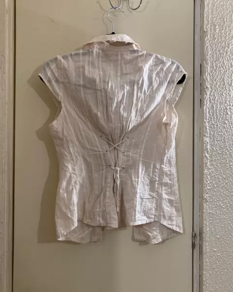 Blusa color beige, botones al frente y jareta cruzada en la espalda, dice grande pero queda mejor a S y tal vez a L