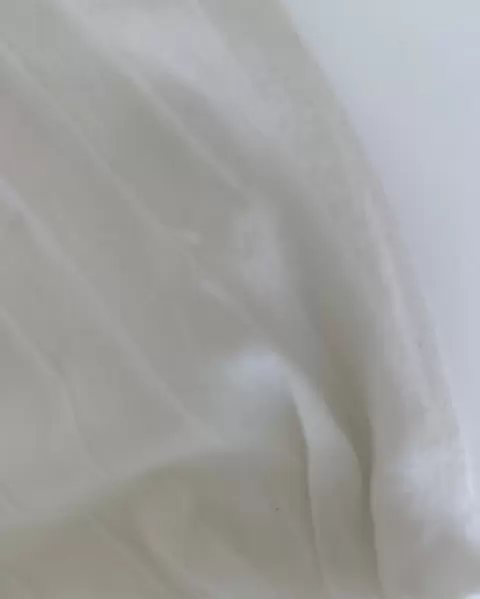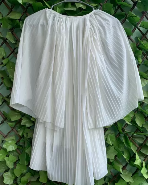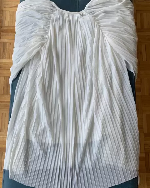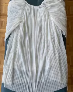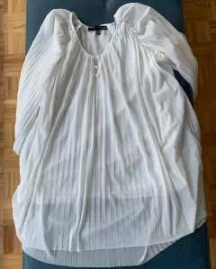 Blusa beige con olanes verticales, lucidora, cómoda y fresca, con una pequeña imperfección