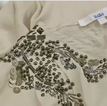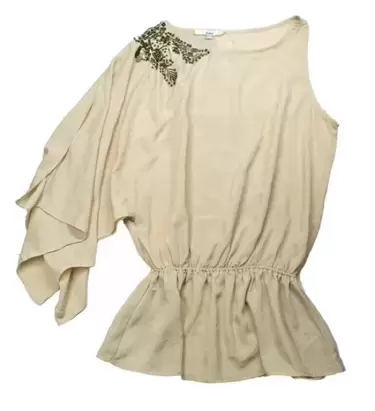 Blusa beige con una manga asimétrica y estoperoles en el hombro con resorte en la cintura talla M, ideal para primavera verano.