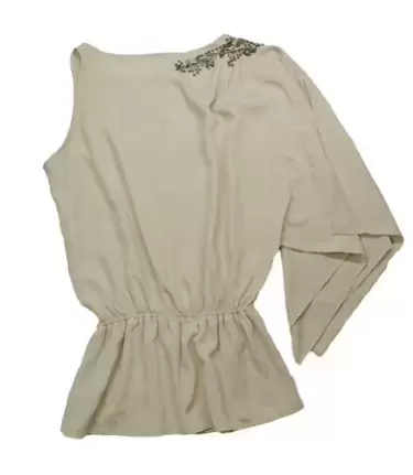 Blusa beige con una manga asimétrica Talla M. Blusa beige con una manga asimétrica y estoperoles en el hombro con resorte en la cintura talla M, ideal para primavera verano.