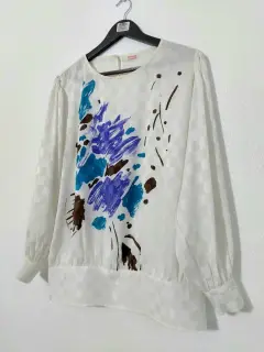 Blusa beige efecto satin. Muy bella.Talla 38, es como talla L.No tiene strech.La tela es poliéster satinada.Luce bella y elegante.