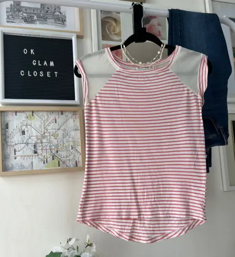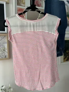 Hermosa blusa a rayas en color rosa y blanco, talla Ch, cuello redondo, no escotada, manga corta