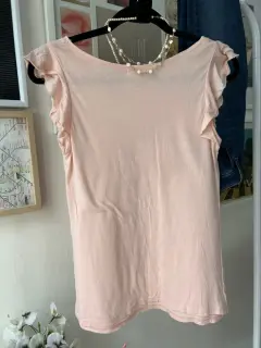 Hermosa blusa color rosa pastel, la tela él delgada y fresca, la manga es corta queda como sin manga ya que es como un tipo Olán, queda muy bonita con jeans