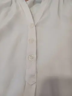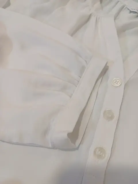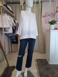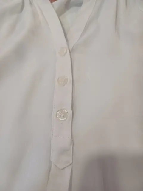 Hermosa blusa blanca con botones en escote. Las mangas son tres cuartos.Las medidas son hombros 51 cm, largo 61 CM.